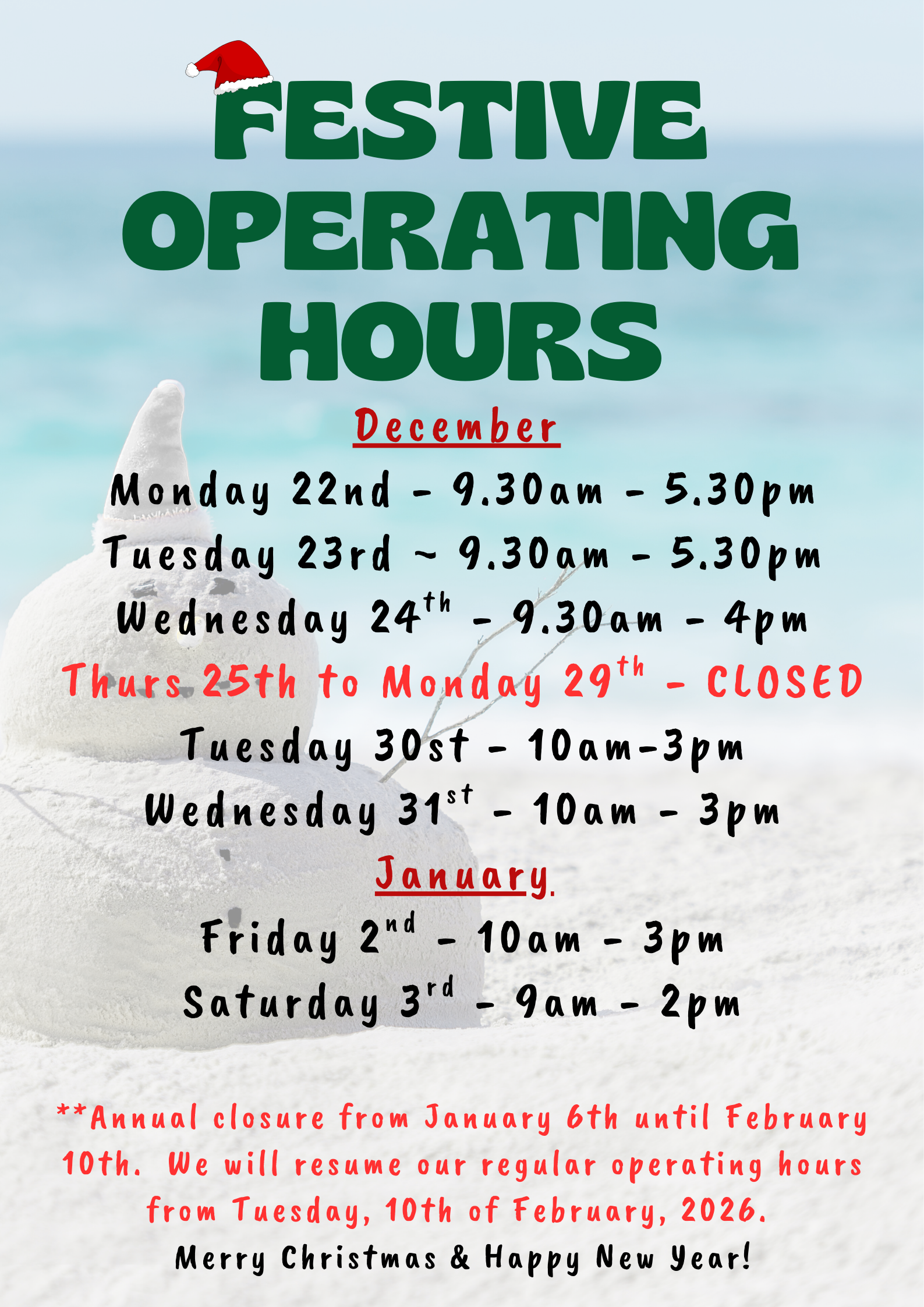 Please find all our altered hours, along with our annual January closure dates! We thank you for all your support both during 2025 and all previous years :)