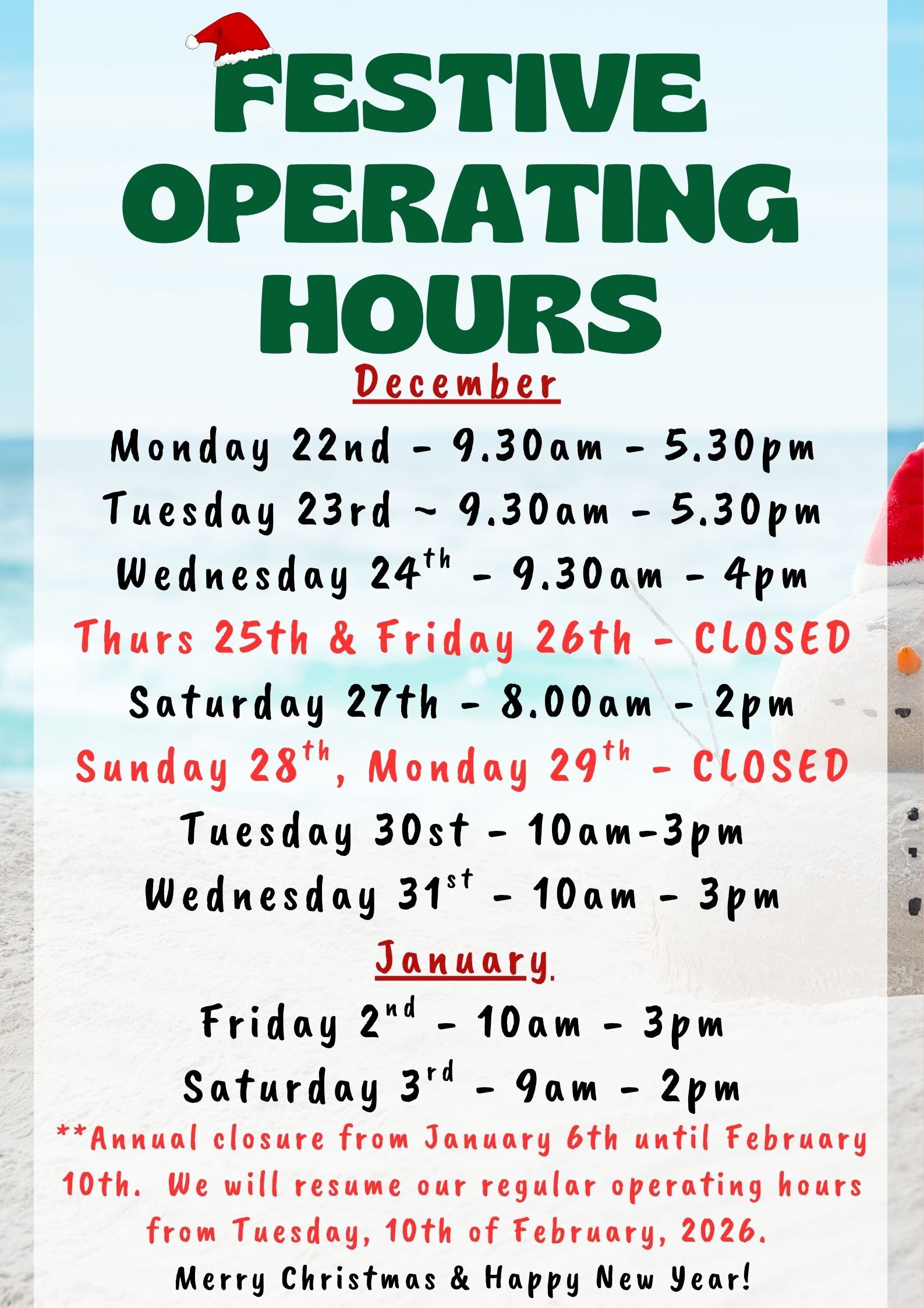 Please find all our altered hours, along with our annual January closure dates! We thank you for all your support both during 2025 and all previous years :)